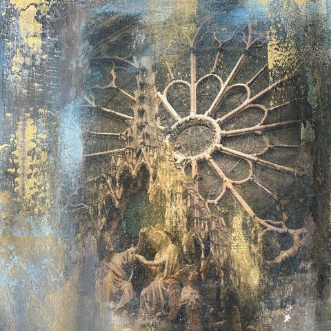 Maleri i mixed media. (Grafisk trykk, akryl og rust) Malt på lerret 42*33 cm