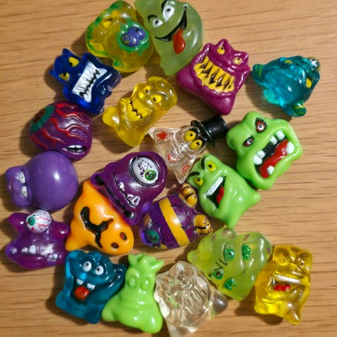 Samling av små plastfigurer i ulike farger og former, inkludert gule, røde, blå, lilla og grønne figurer. Figurene har varierende uttrykk og detaljer, og kan brukes til dekorasjon eller samling.