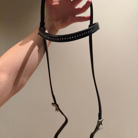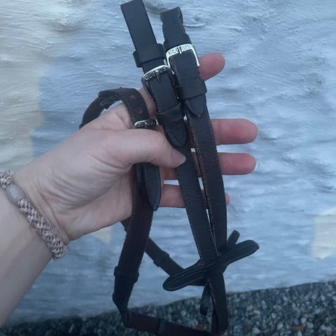 Tøyler med stopper fra Denni design(Dyon). Lær på utsiden, gummi/grip på innsiden. Sort str cob. Brukt, men hele og fine :)