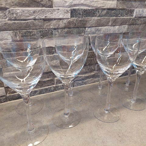 Kosta Boda vinglass 35cl Line Gold sett bestående av 8 glass i klart glass med gull linjer. Glassene har stilige detaljer og passer til servering av vin. Selges kun samlet. Ett glass har litt mindre gull langs linjen men fortsatt fint .