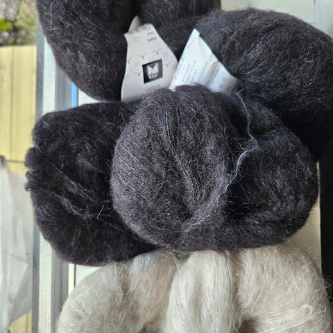 4 nøster tynn kidsilk erle, i utgått grønn melert farge. (1stk solgt)