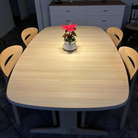 Vi selger et Skovby spisebord i heltre. Modell dc05. Pent bord, som kan trekkes ut men mangler ileggsplatene.