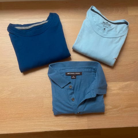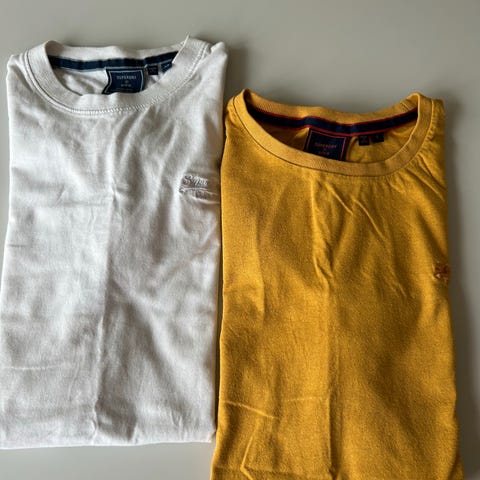 To t-skjorter selges samlet, de er lite brukt, men den blå har lysnet noe under armen.