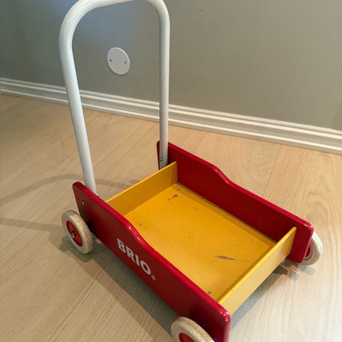 BRIO gåvogn i tre med røde detaljer. Er et merke i selve vognen som du kan se på bildet, ellers topp stand.