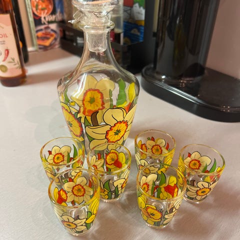 Selger et sjarmerende vintage glassett bestående av 1 karaffel og 6 matchende glass, dekorert med klassisk kirsebærmotiv i rødt og grønt.