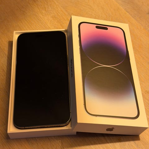 Selger en Apple iPhone 14 Pro med 128 GB lagring i lilla farge (Deep Purple). Telefonen fungerer helt som den skal og har vært brukt med skjermbeskytter og deksel. Eventuelle skrap du ser på bilder er isåfall skjermbeskytteren.