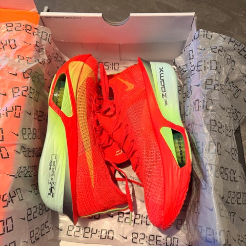 Nike Air Zoom Alphafly Next% 3 løpesko i størrelse 38, rød farge. Skoene er designet for løping og har teknologier som ZoomX-skum for demping og støtte under løpeøkter.