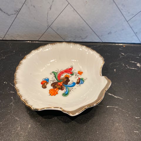 vintage, retro, småfat, porselensfat, skåler, askebeger, dekor, pynt, interiør, samleobjekt, samling, håndmalt porselen, gullkant, blomsterdekor, glasskål, blått glass, smykkefat, pyntefat, borddekor, klassisk stil, romantisk stil, midcentury