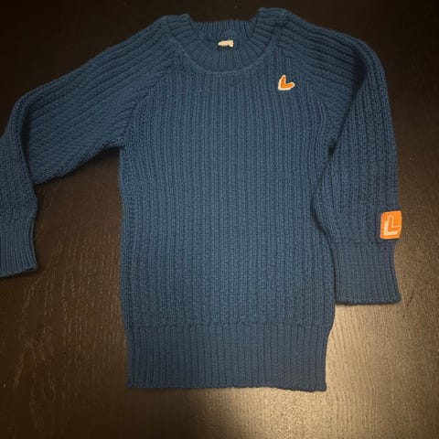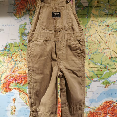 Kul snekkerbukse i litt mørkblå denim med metalldetaljer i bronsefarge. Lappen er klippa av, men er 18mnd eller str 86 meiner eg.
