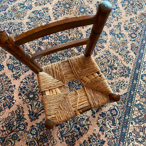 En praktisk barnestol med sele som kan tas med på tur og som justeres i ryggen til å passe ulike stoler. Må hentes.