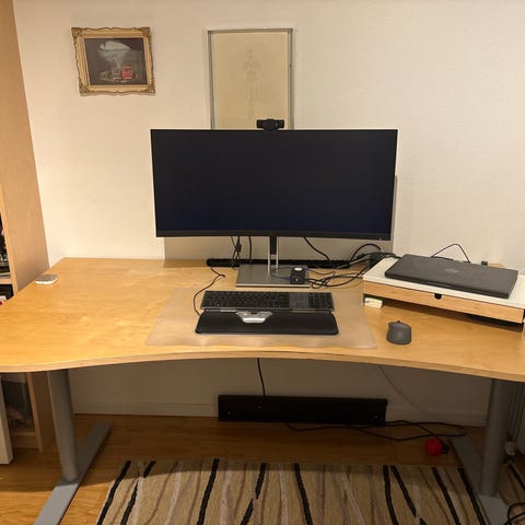 Selger en pen brukt hvit hev-og-senke pult fra Pomelo. Elektrisk heve funksjon.