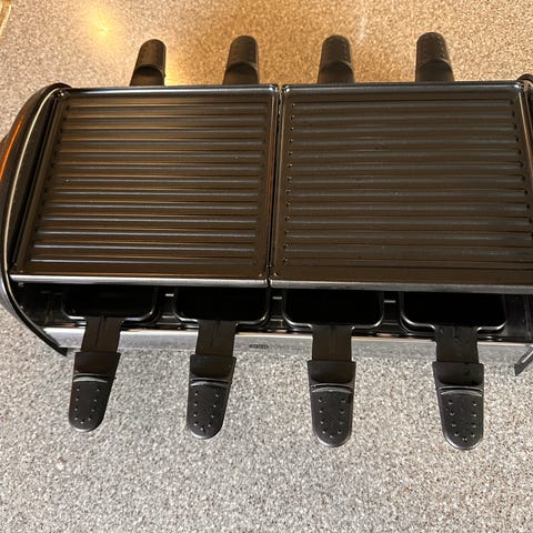 Selger min gamle Severin racklette da jeg har fått en ny. Rackletten er delt med stein på ene halvdelen og metall på andre. Det følger med 8 stk spader til å sette under for gratenering av tilbehør.
