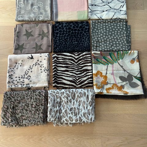 Lett, men likevel varmt, skjerf i sort og hvitt mønster vevd i den mykeste ull (90%) og kasjmir (10%). Kvadratisk 90x90 cm. Brukt noen få ganger. Vasket på ullvask. Ingen bruksmerker.
