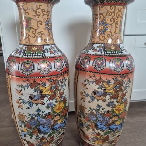 To store, dekorative gulvvaser i orientalsk stil som gir rommet karakter og særpreg. Dette er ikke nøytral pynt som forsvinner i bakgrunnen, men tydelige blikkfang som skaper kontrast og fungerer som et naturlig centerpiece i et hjørne eller et åpent rom.