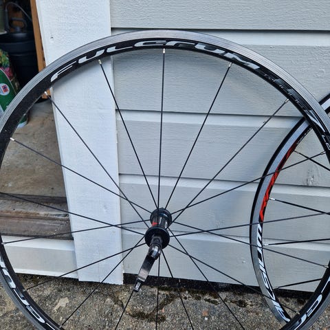 Selger et Mavic Cosmic SLE forhjul. Clincher med 9 mm aksling. Ruller fortsatt godt.
