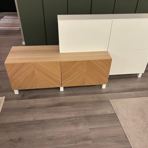 Oppbevaringskommode med åpne hyller og dører under. Fra IKEA, serien BESTÅ. Hvit høyglans. To hylleplater i glass, og en vanlig hylleplate følger med. På toppen er det også en glassplate.