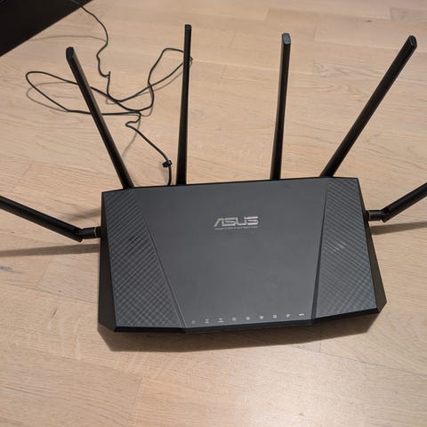Selger en ASUS RT-AC5300 Tri-Band Gigabit Router i topp stand. Dette er en tidligere high-end-modell (nypris ca. 5000 kr), kjent for ekstrem ytelse, stabilitet og dekning. Perfekt til gaming, streaming, smart-hjem – eller som et meget kraftig aksesspunkt.