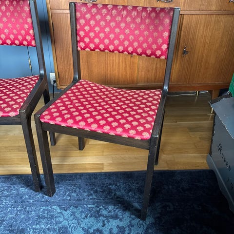 Stolene er stabile og komfortable, med normal bruksslitasje i stoff sett i forhold til alder.