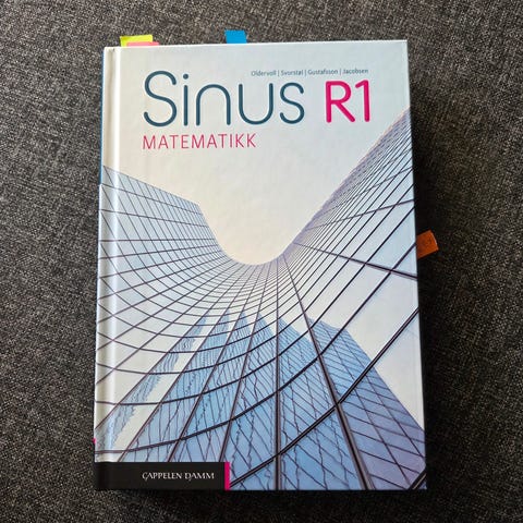 Matematikk R1 lærebok selges for 200kr. Boken dekker sentrale emner i matematikk for videregående opplæring.