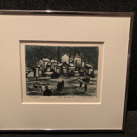 Tidstypisk litografi fra 1967, trolig tresnitt. 32 x 45 cm ramme (eik?), mens selve motivet med signatuen trenger minst 19 x 25 cm åpning i passepartout eller ramme. Kunne godt fått et nytt passpartout. Tittel Småbåthavn, tror det er signert Ivan Juven.