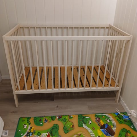 Den er ikke synlig brukt, bilde nummer to så er den slått sammen så godt vi greide. Den har vært til to barn. Lite brukt, og når brukt så lå de alltid oppi nesten sin og et håndkle under der igjen. Utrolig fin og vi har hatt mye glede av den. Selger den grunnet barna har blitt for store
