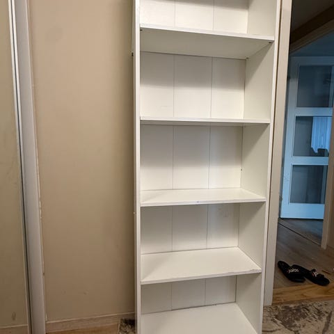 To bokhyller, hver seksjon delt i to. Kjenner ikke til produsenten. Begge skapene har 4 hyller til å feste på ønsket sted, se bilder. Må hentes