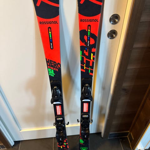 Rossignol Hero R17 R-ski med lengde 151 cm. Skiene har Power Turn-teknologi og er designet for posisjon Racing Team. Fargene er rødt, hvitt og blått. Bindinger er montert på skiene.