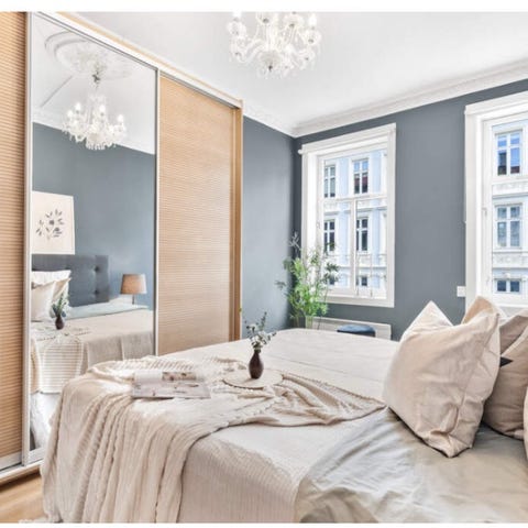 Garderoben med speildører har stått i en nisje som er ca 1,35 m bred, høyde 2,19 m. To hyller øverst, stativ med trådkurver og stang til kleshengere under.
