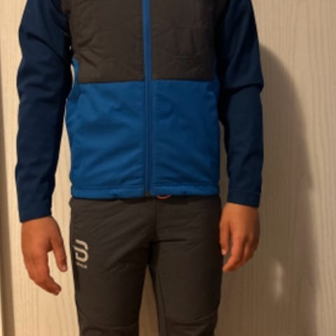 Skijakke og bukse i størrelse 128. Buksa er elastisk bak, vindtett foran og glidelås langs hele benet. Det ene kneet har hull som er reparert.