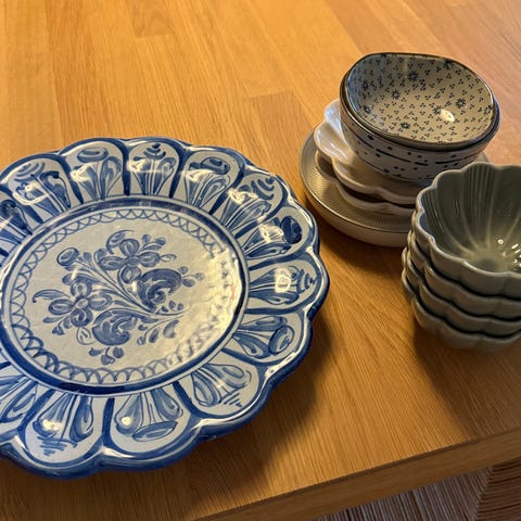 En stor og 6 små skåler selges samlet