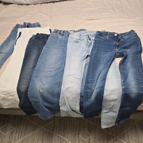 Det beige settet er kun brukt ein gong, det rosa et par gonger, det grå et par gonger, jakka kun ein gonger. Litt nupper. Og liten svak flekk i baken på grå buksa.