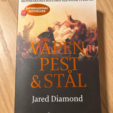 Selger boka « Våpen, Pest & Stål» av Jared Diamond Boken dekker temaer knyttet til historiske utviklinger, inkludert våpen, sykdommer og metallbruk.
