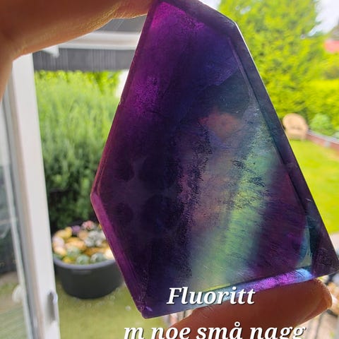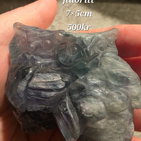 Delfin utskjært i høykvalitets fluoritt. Denne er rosa/lilla og gul i fargen. Ca 7cm x 2,5cm.