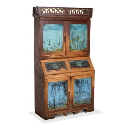 Vakkert og velholdt hjørneskap i tre med flere oppbevaringsmuligheter inkludert skuff, skapdører og hyller. Skapet har dekorative utskjæringer og er ubehandlet, noe som gir mulighet for tilpasning av overflatebehandling.