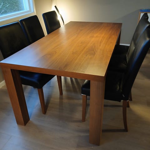 Spisebord fra Jysk og 4 stk svarte velourstoler fra Skeidar selges. Stolene er pent brukt og i god stand uten bruksmerker/flekker. Spisebordet har noen merker i bordplaten, dette har kommet under flytting.