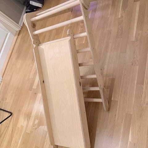 Klatrestativ for barn med flere aktivitetsmuligheter inkludert sklie, tau, ringer, klatrestige og klatrevegg. Laget av tre med naturlig finish. Kompakt design som passer til innendørs bruk. Mål: 124 cm bredde, 110 cm høyde, 99 cm dybde.