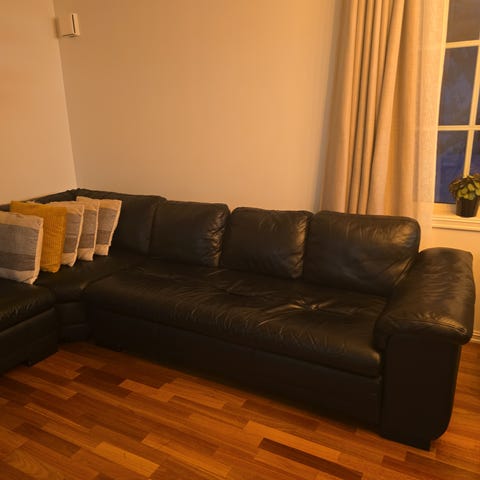 Jeg selger en grå sofa i semsket skinn.