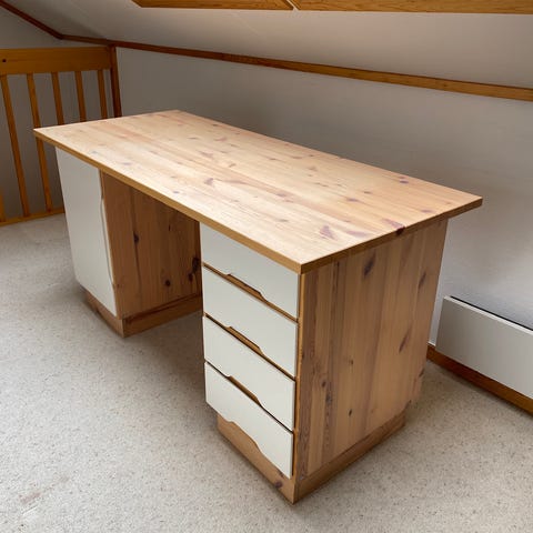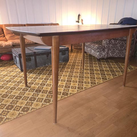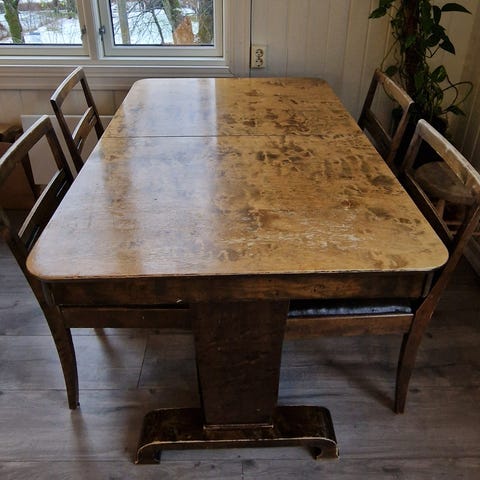 Bordplate er lakkert i mørket tre farge, lite lakkeringflekker, ellers det er et solid og fint bord, kan lett slipps ned, sands, lakkes og oljes så blir da et perfekt robust bord.