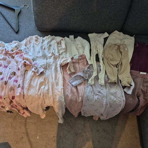Pakken inneholder én pysj i str 68, men den er stor i str. Har sett gjennom alle klærene og finner ingen flekker eller hull.