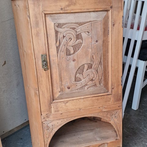 Kaffebord i heltre med rundet bordplate og to buede stoler med ryggstøtte. Bordet har nedfellbare klaffer. Stolene har polstrede seter med ulltrekk. Møblene har en naturlig trefinish og settet har veldig hendig størrelse som gjør det fleksibelt å møblere.