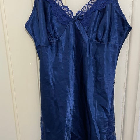 Selger en pent brukt Missya nattkjole i blå farge, størrelse M. Laget av polyester og elastan, med blondekant ved halsen. Brukt kun 1-2 ganger, selges da den ikke passer nå. Ingen bruksmerker.