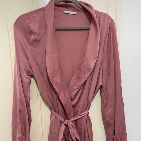 Selger en pent brukt blå nattkjole i sateng med blonder, størrelse M for dame. Kjolen har tynne stropper, V-utringning med blondedetaljer og blondestoff på sidene. Materialet er glatt og glansfullt. Brukt kun 1 gang, selges da den ikke passer helt. Ingen bruksmerker.