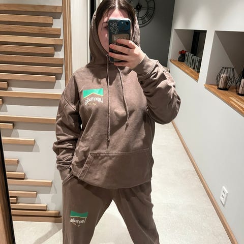 Ubrukt kose sett i str L men den er litt liten i str så vil sundet er en litt stor M. matriale er i plusj tror jeg det heter. Veldig mykt. Leopard print å genseren har en hette med ører.