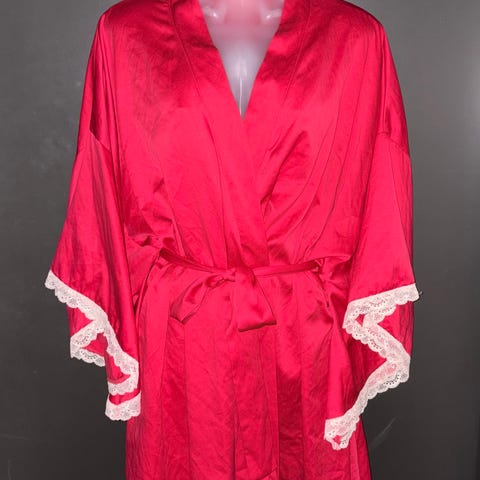 Selger en pent brukt rosa pysj med bukse i størrelse M for kvinner. Den har blomstermønster på krage og mansjetter. Materialet har en glatt og lett glans, og kåpen har knapper foran samt belte i midjen for justering. Designet inkluderer lange ermer. Brukt kun 1 gang, selges da den ikke passer helt. Ingen bruksmerker.