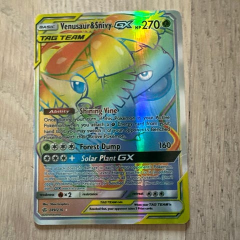 Venusaur & Snivy GX – flott TAG TEAM-kort i veldig bra stand. Pent oppbevart med rene kanter og blank holo uten synlige skader. Populært samlekort med stilig design, perfekt for både samlere og spillere. Klar for ny samling! 🌿✨