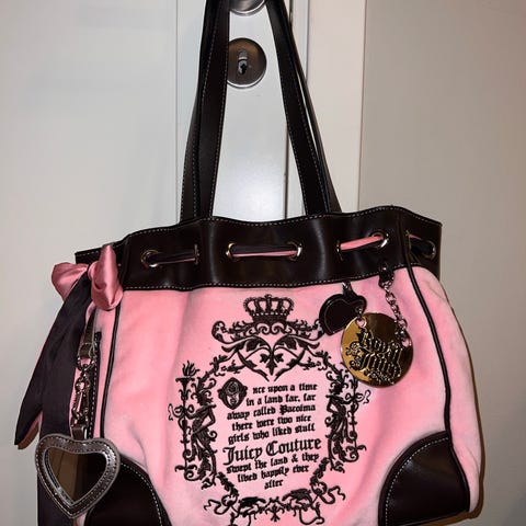 Juicy Couture dameveske i rosa og brun farge. Vesken har skulderstropper og dekorative detaljer, inkludert et hjerte og et emblem på fronten. Den har flere rom og lommer for oppbevaring. Veldig skjelden. Ny med lapp