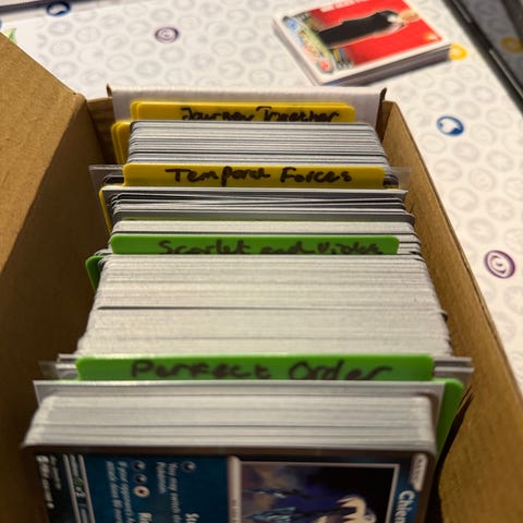 White Flare pokemonkort med flere kort i en oppbevaringsboks. Boksen inneholder vanlig, Holo og reverse.