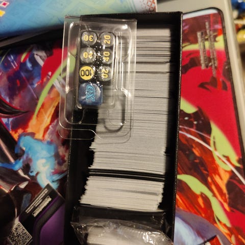 Mega evolution og phantasmal flames pokemonkort med flere kort i en oppbevaringsboks. Boksen inneholder vanlig, Holo og reverse.