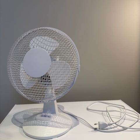 Otermo bordvifte i svart farge med rund design og beskyttende gitter. Egnet for bruk på skrivebord eller mindre områder for oppvarming og kjøling.