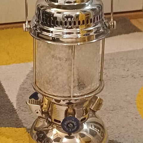 Pent eksemplar av Petromax 821/250CP trykklampe. Trolig produert på 50 tallet. Testet og brenner meget flott. 2 glødenett følger med. Høyde på lampa er 32 cm. Drivstoff parafin. Forvarmes med rødsprit.
